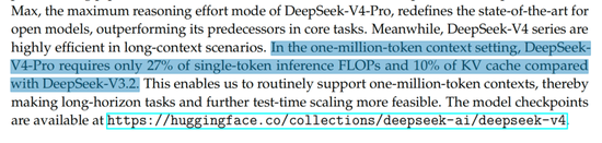In the one-million-token context setting, DeepSeekV4-Pro requires only 27% of single-token inference FLOPs and 10% of KV cache compared with DeepSeek-V3.2.