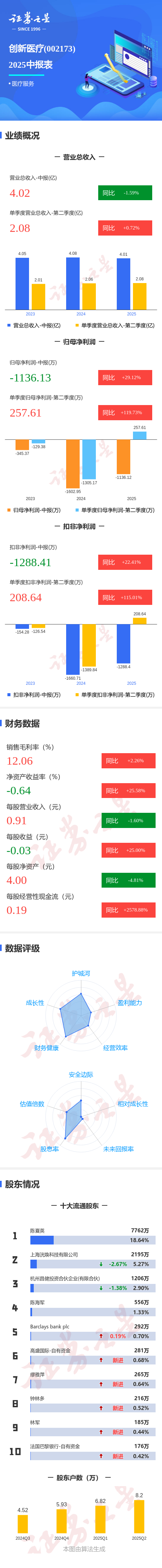 证券之星消息,创新医疗2025年中报显示,公司主营收入4.02亿元,同比下降1.6%;归母净利润-1136.13万元,同比上升29.12%;扣非净利润-1288.41万元,同比上升22.42%;其中2025年第二季度,公司单季度主营收入2.08亿元,同比上升0.73%;单季度归母净利润257.61万元,同比上升119.74%;单季度扣非净利润208.64万元,同比上升115.01%;负债率18.03%,投资收益-259.52万元,财务费用36.03万元,毛利率12.06%。